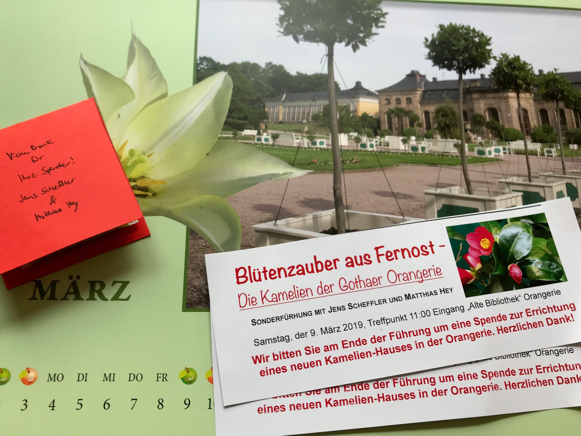 Der Verein der „Orangerie-Freunde“ Gotha e.V. führt regelmäßig Führung in der Gothaer Orangerie durch. Am 09.03.2019 hatten wir das Vergnügen, an einer Führung teilzunehmen. Weitere Informationen auf der Internetseite von Matthias Hey. Ein kleiner Artikel in der Lokalpresse vom 19.03.2019 verkündet, dass für den Bau eines neuen Kamelienhauses inzwischen 65.000 Euro gesammelt wurden, Details hier ->.