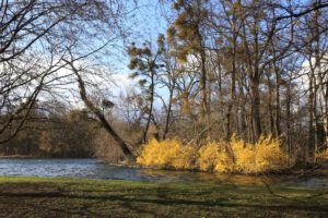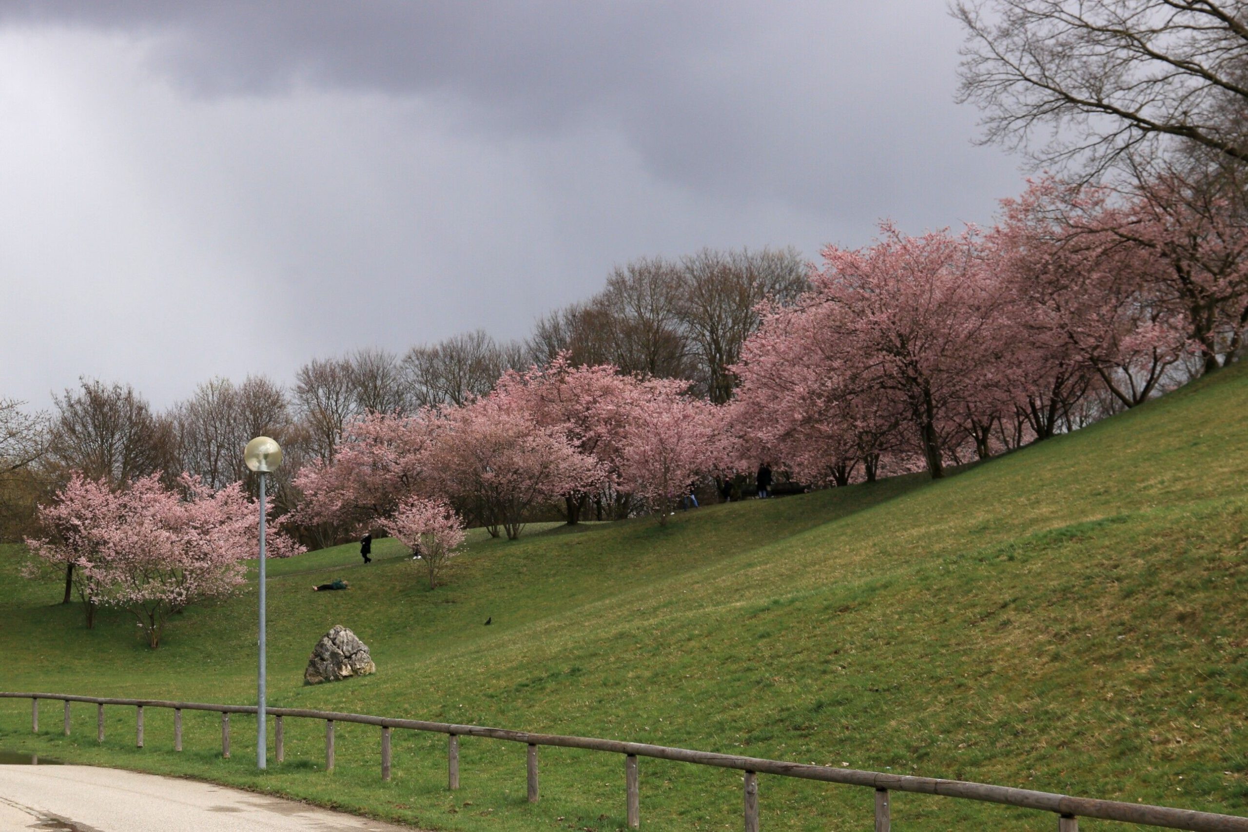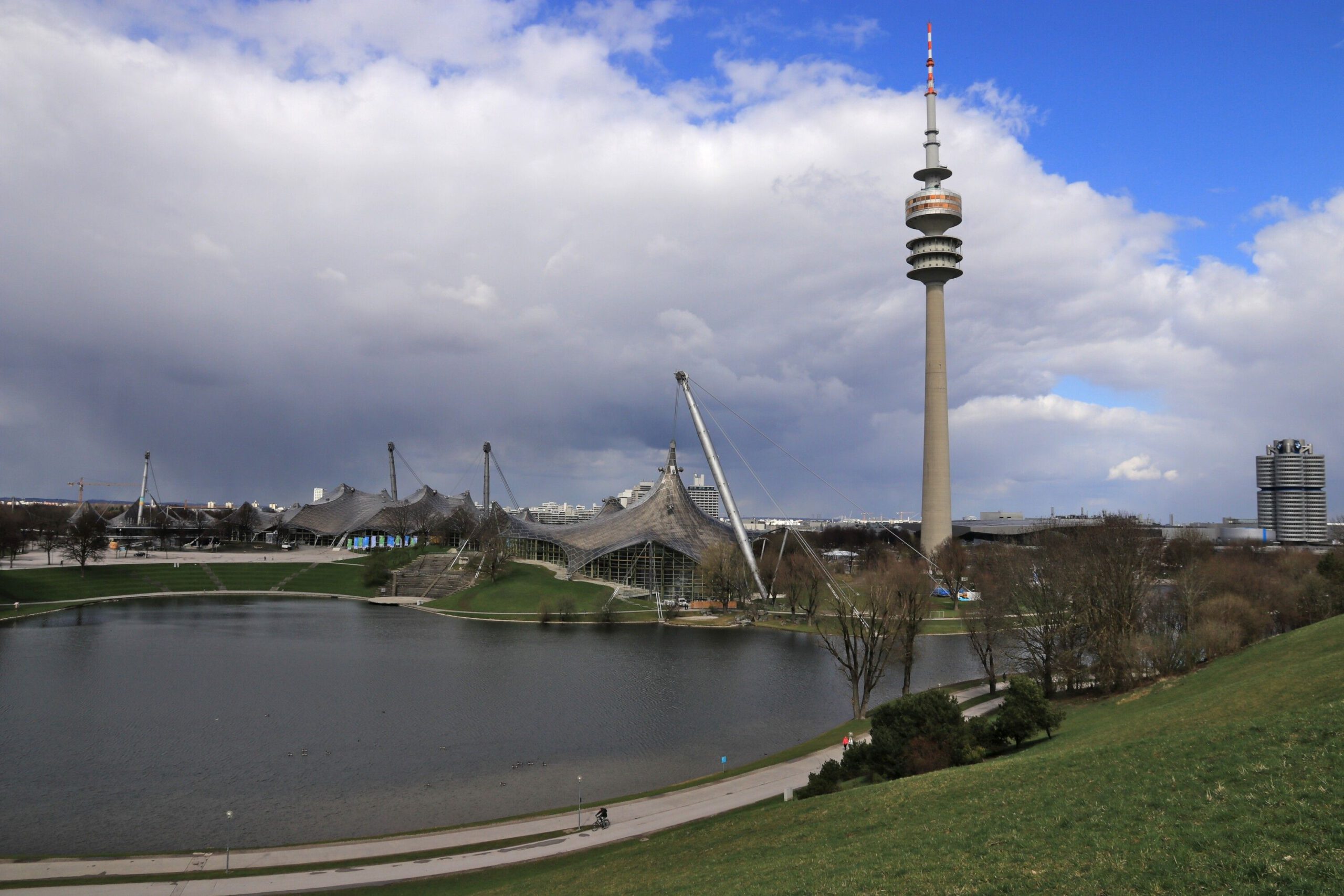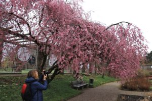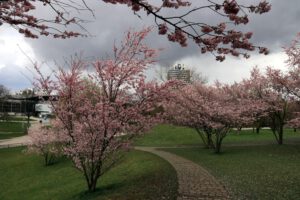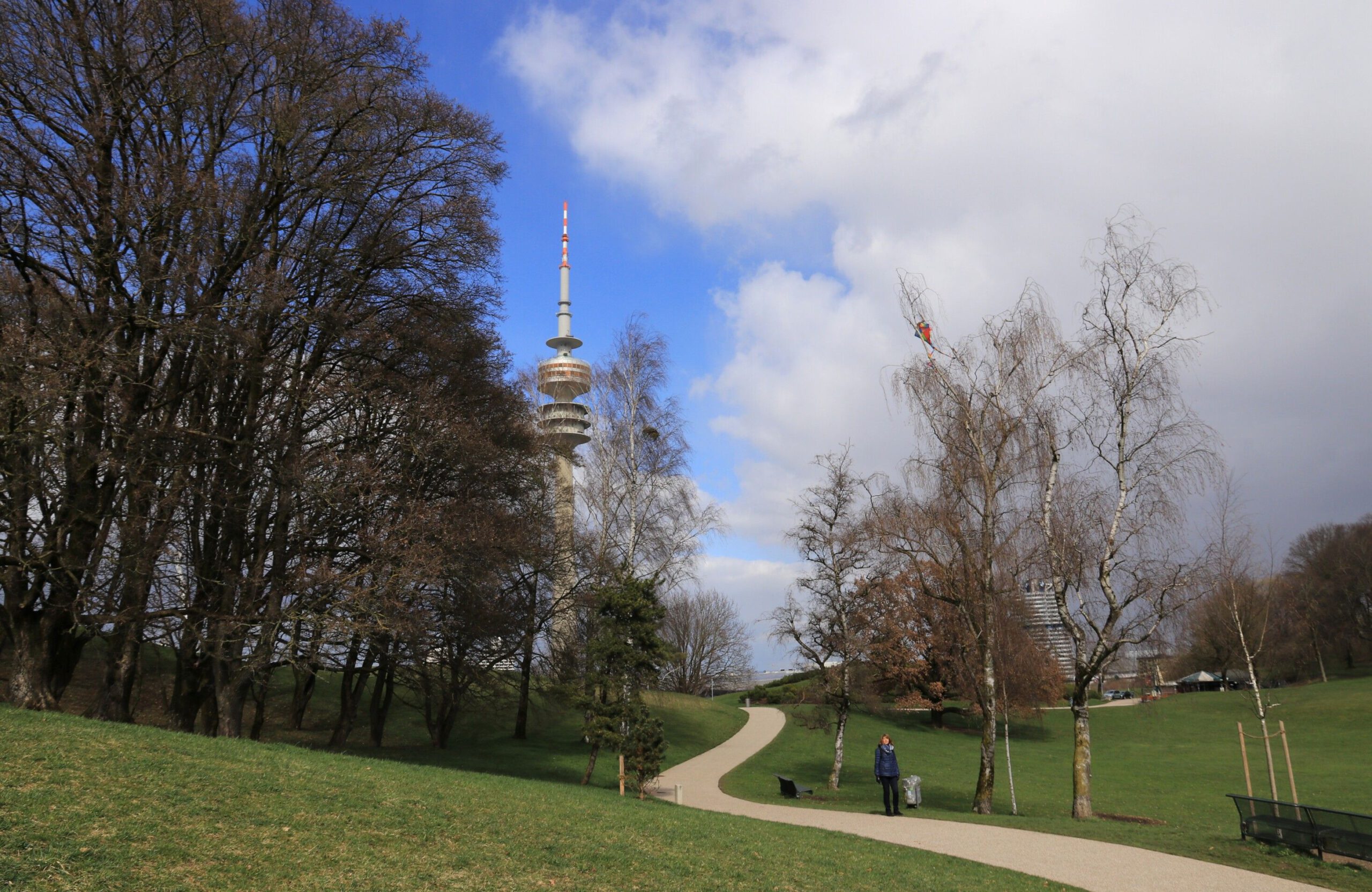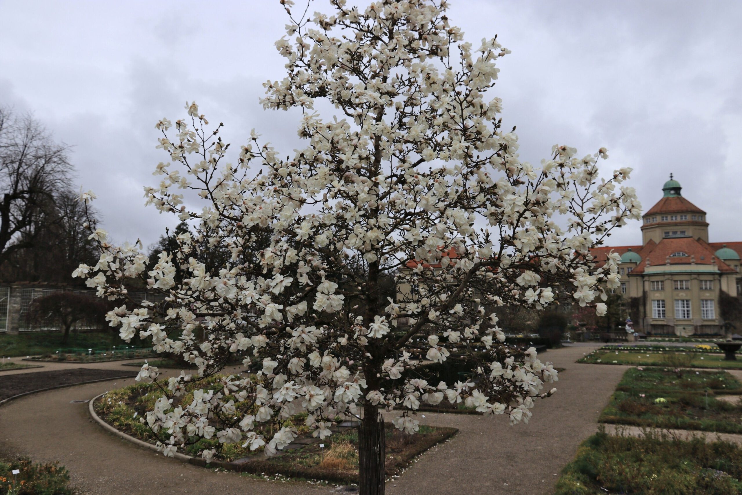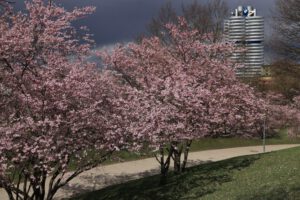 Am Montag, bundesweiter Streiktag von verdi und EVG, besuchten wir zunächst den Botanischen Garten München-Nymphenburg. Da das Wetter immer noch sehr wechselhaft war, konnten wir in aller Ruhe die vielen Gewächshäuser erkunden. Am Nachmittag wanderten wir am Nymphenburg-Biedersteiner Kanal entlang zum Olympiapark, weil es dort blühende Kirschbäume geben sollte. Am anderen Ende kurz vorm Vierzylinderturm von BMW fanden wir die Bäume. Auch die Sonne hatte ein Einsehen und schaute immer mal vorbei.