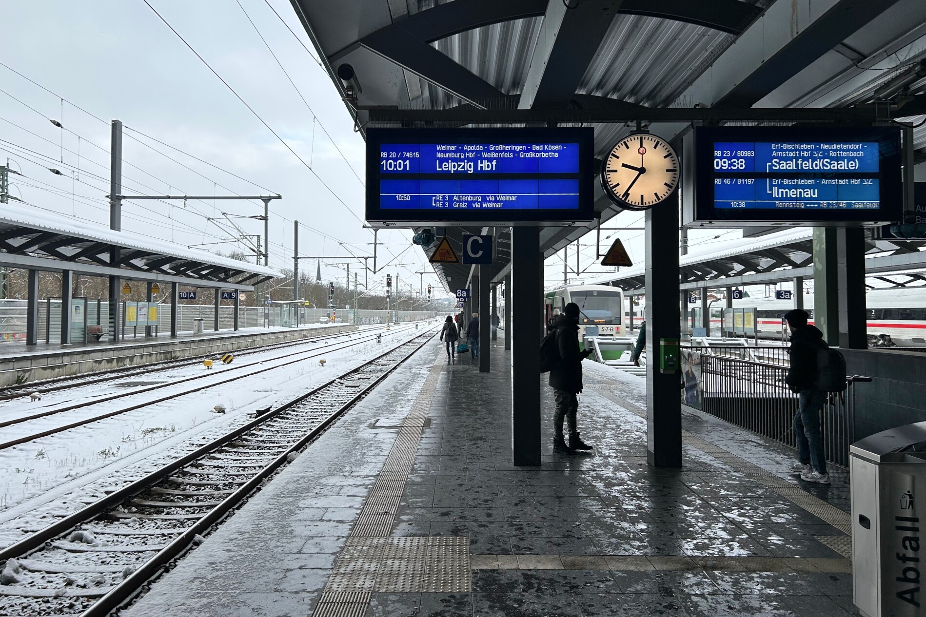 Ich änderte in der Situation den Plan und wählte die Variante eigener PKW. Der ICE meiner Tochter aus dem Rheinland hatte auch Verspätung. Wir starteten dann von Erfurt und nicht wie geplant von Leipzig aus gemeinsam die Weiterreisen. Nachteil: teure Autofahrt, teure Parkgebühr im Hotel, die letzten 50 km Landstraße anspruchsvolle Winterbedingungen. Vorteil: Zeit mit meiner Tochter.