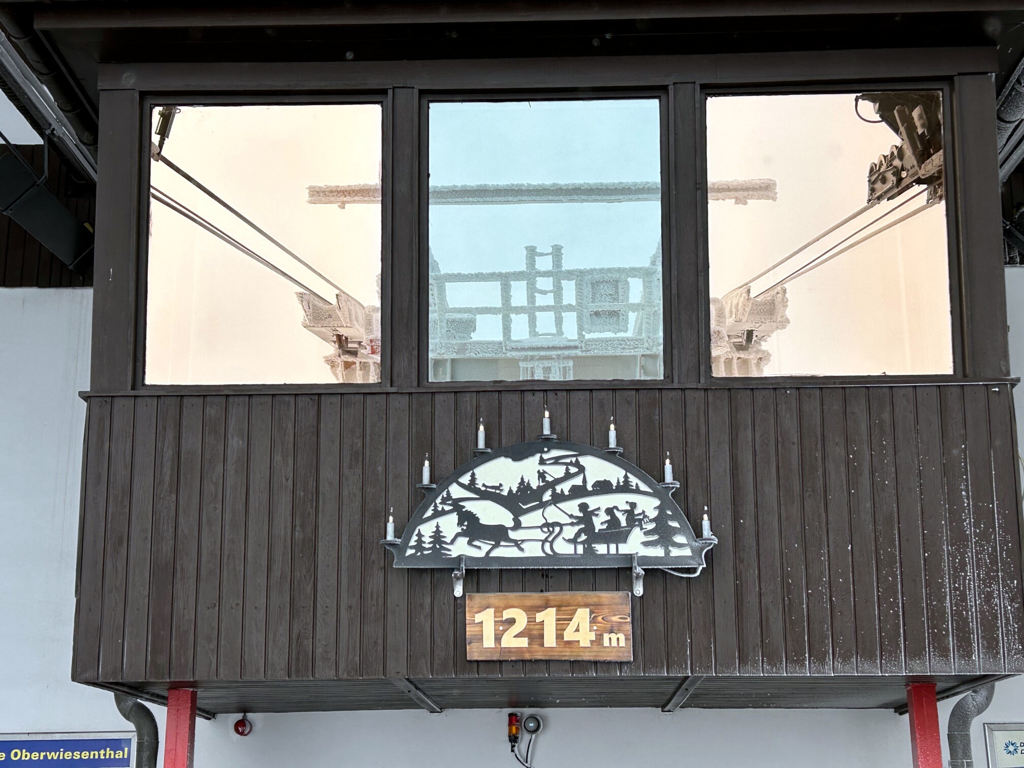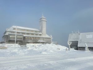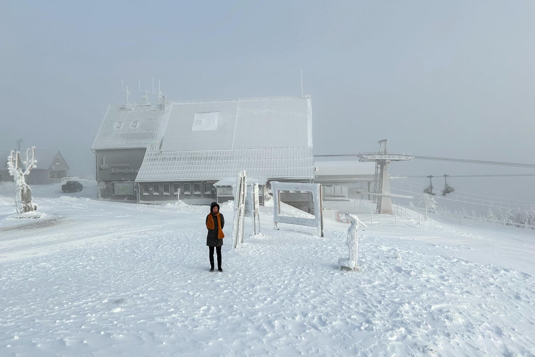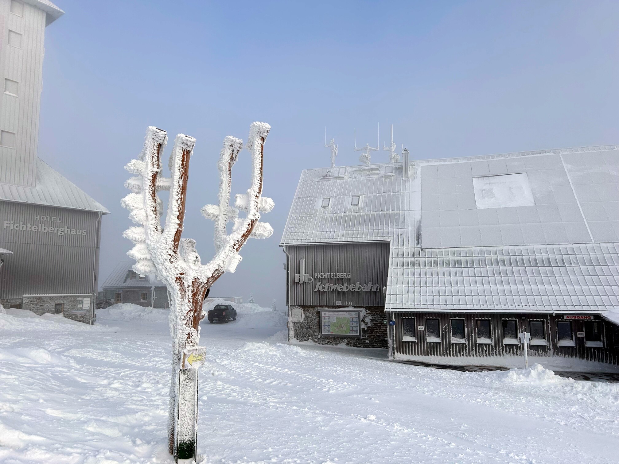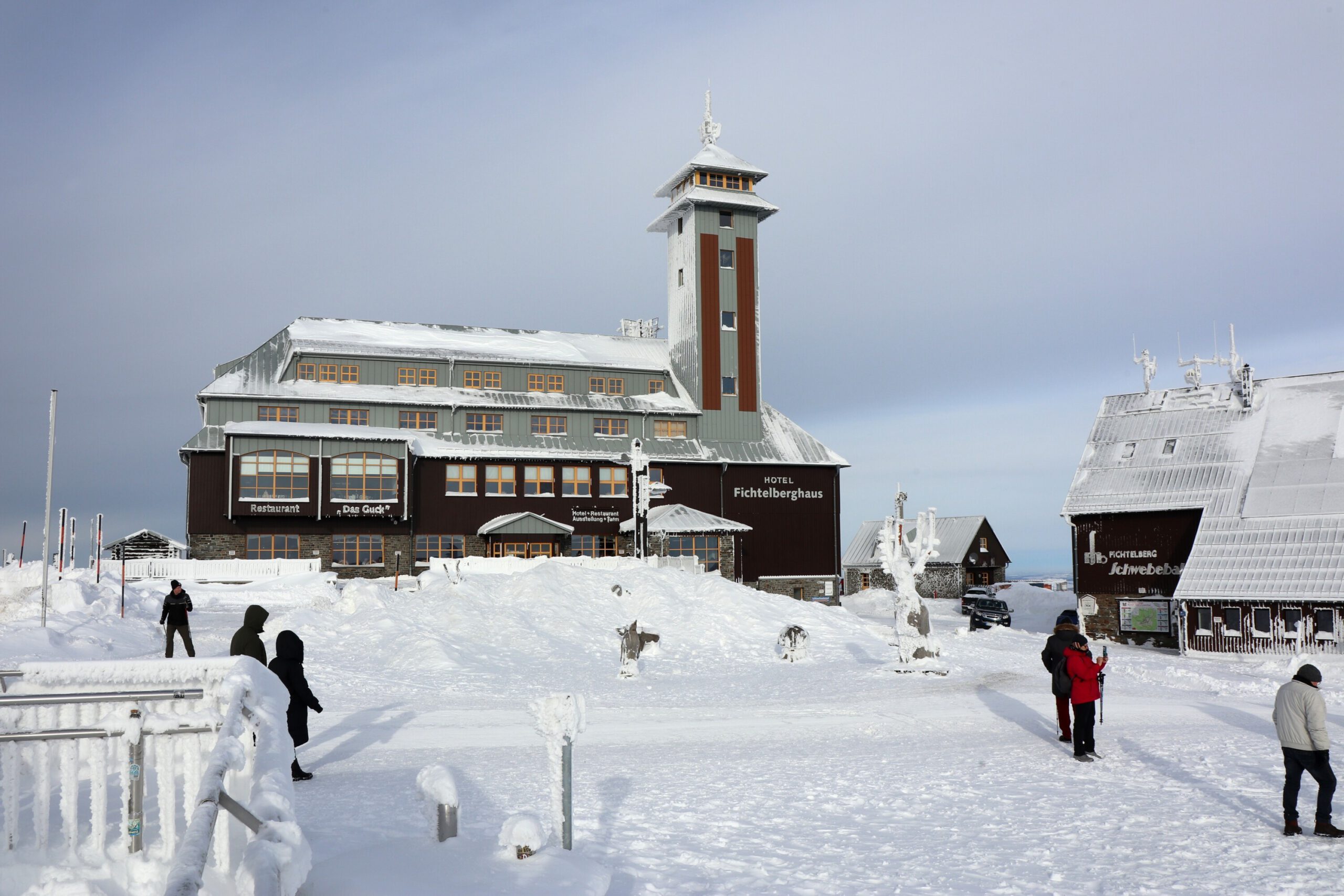 Am Mittwoch, unserem Abreisetag, wurde die Skisaison in Oberwiesenthal eröffnet. Mit der ersten Seilbahn fuhren wir zum Gipfel. In der Bahn waren eine handvoll Wintersportler, aber keine weiteren Touristen. Im Gegensatz zum Montag hatten wir den Gipfel für uns allein. Der Sessellift zum Gipfel war schon gut ausgelastet.