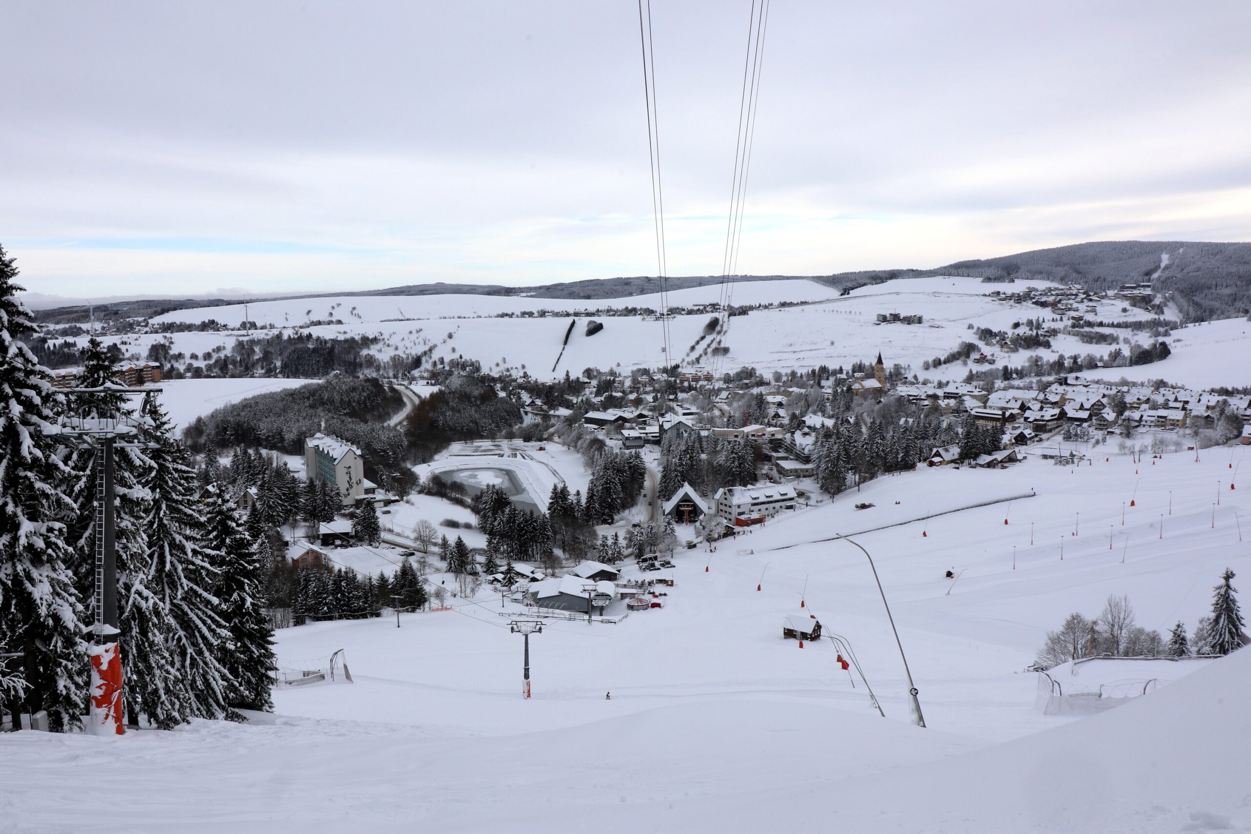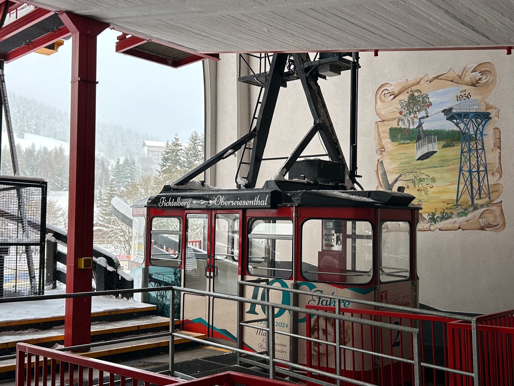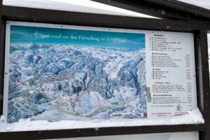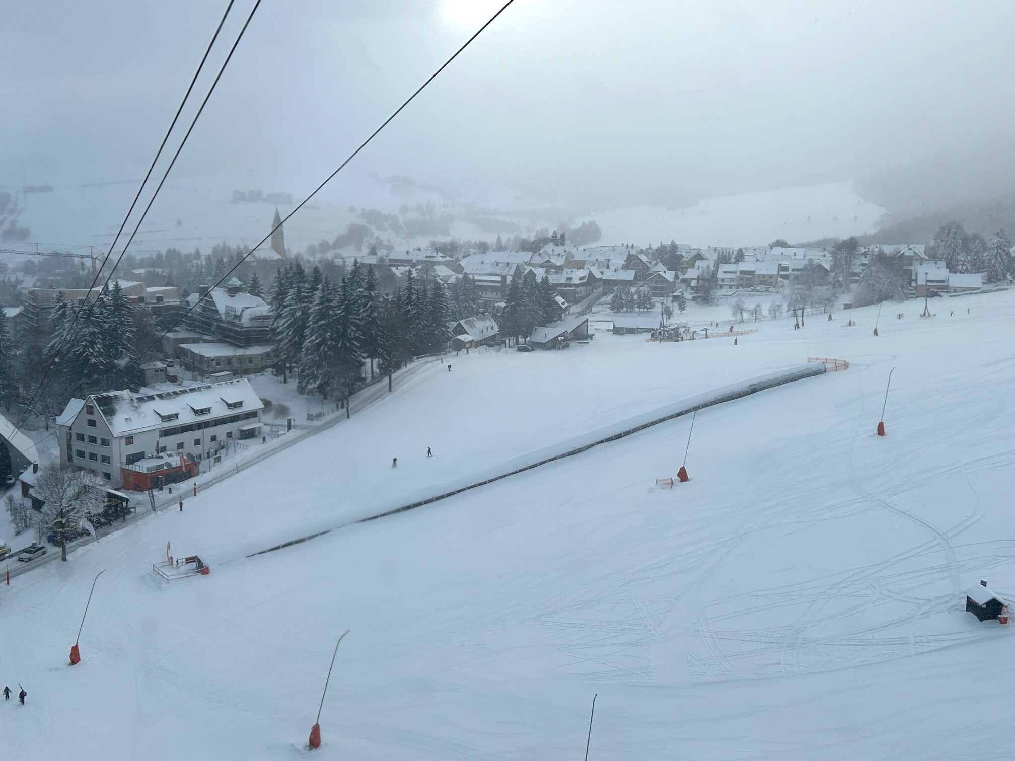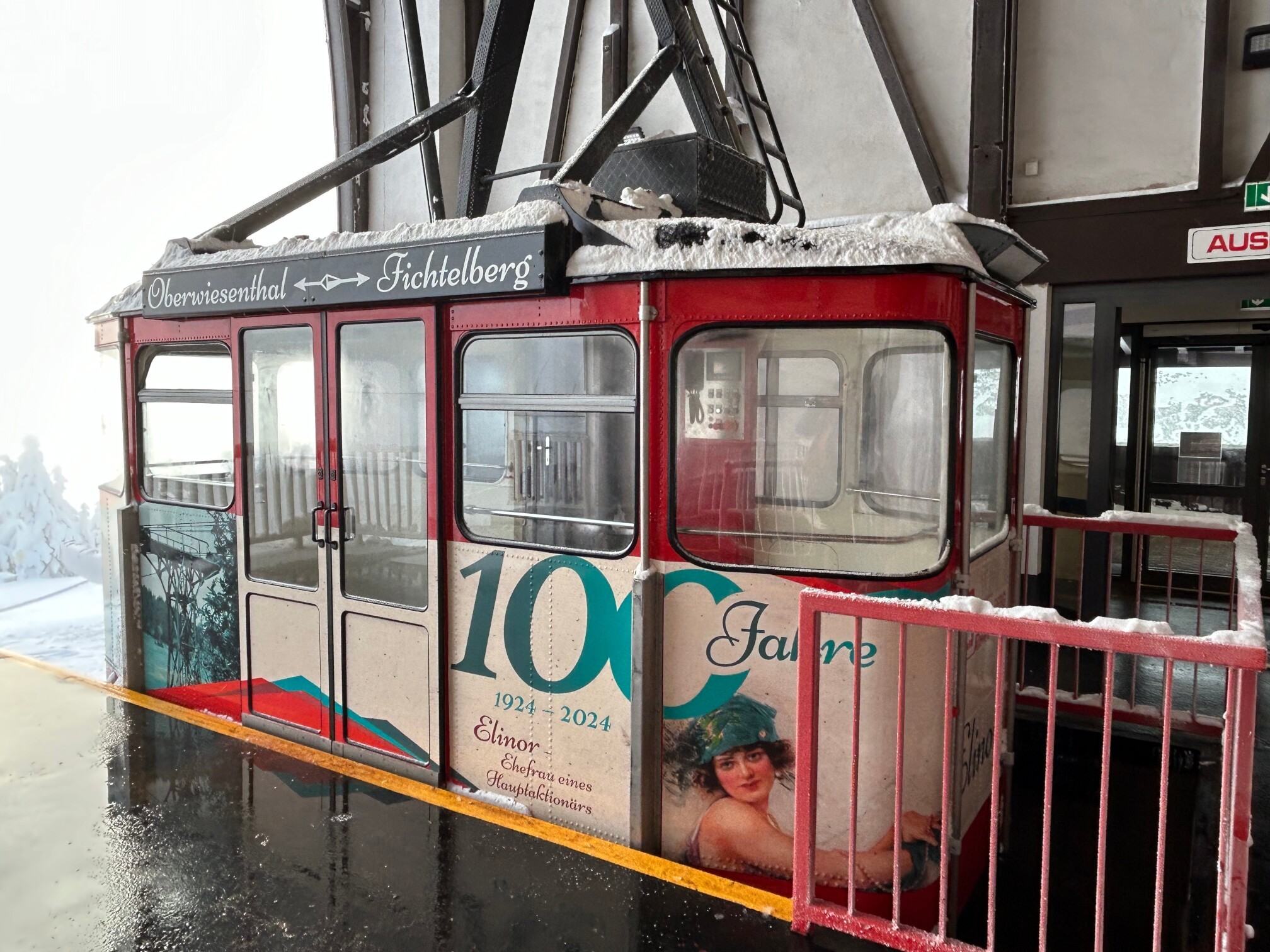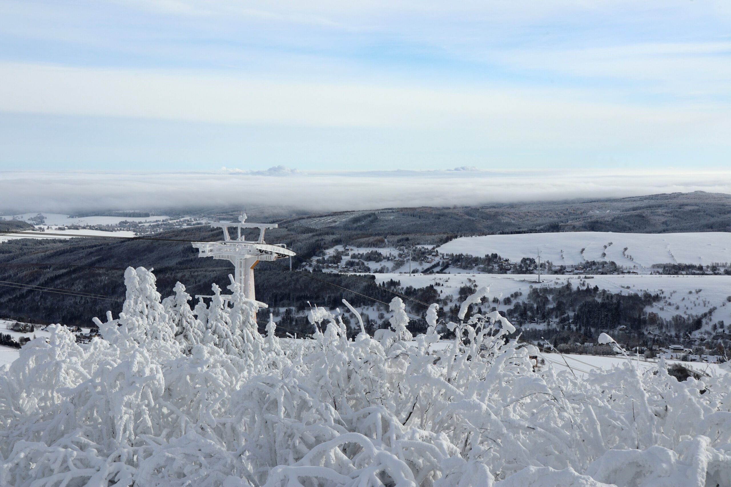 Am Mittwoch, unserem Abreisetag, wurde die Skisaison in Oberwiesenthal eröffnet. Mit der ersten Seilbahn fuhren wir zum Gipfel. In der Bahn waren eine handvoll Wintersportler, aber keine weiteren Touristen. Im Gegensatz zum Montag hatten wir den Gipfel für uns allein. Der Sessellift zum Gipfel war schon gut ausgelastet.