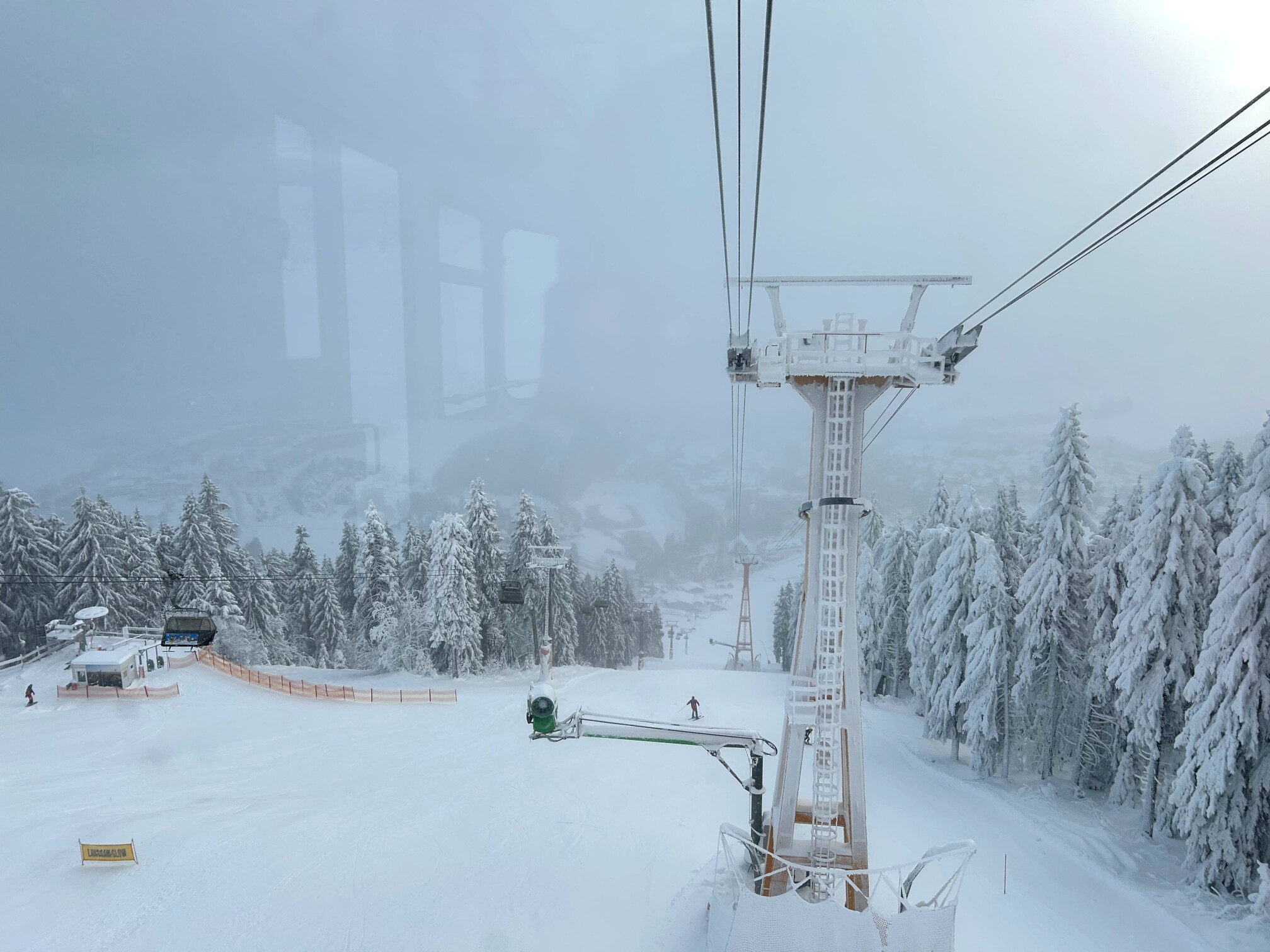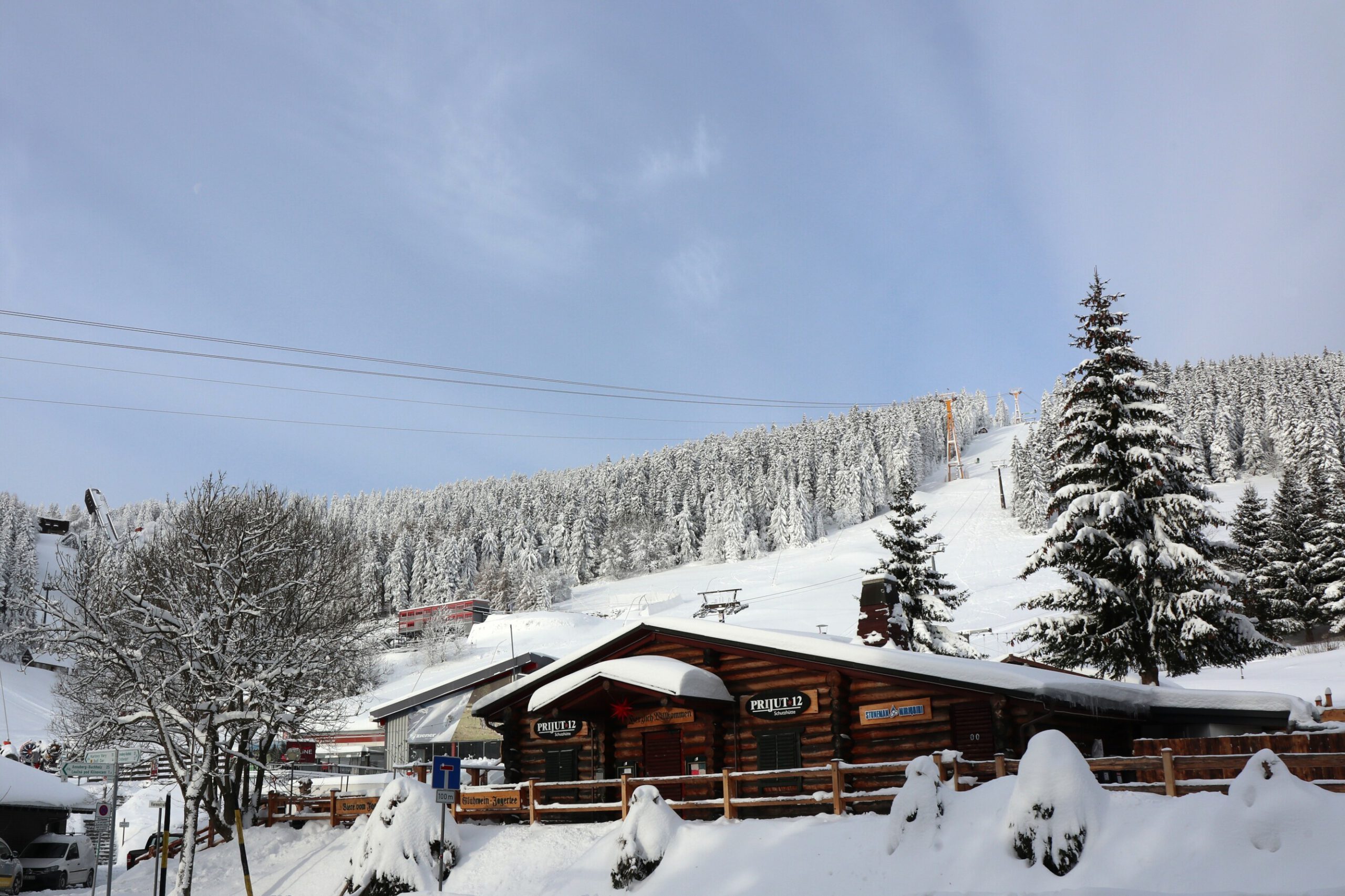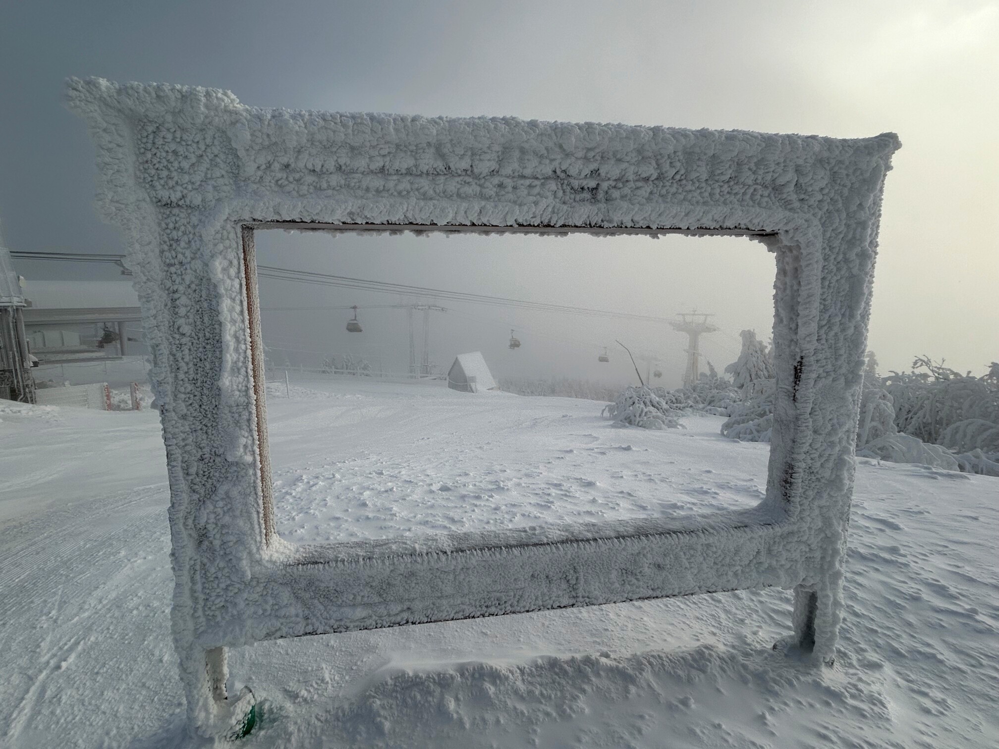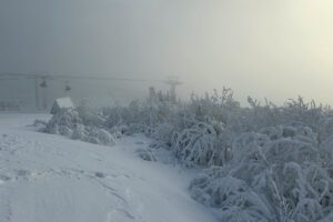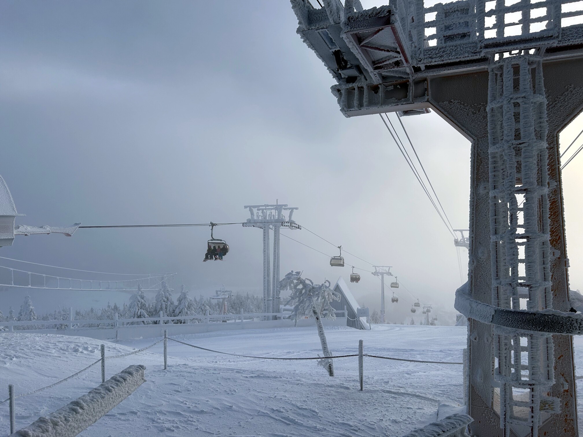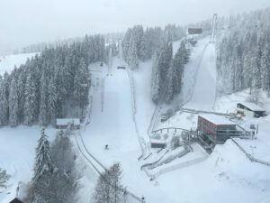Am Mittwoch, unserem Abreisetag, wurde die Skisaison in Oberwiesenthal eröffnet. Mit der ersten Seilbahn fuhren wir zum Gipfel. In der Bahn waren eine handvoll Wintersportler, aber keine weiteren Touristen. Im Gegensatz zum Montag hatten wir den Gipfel für uns allein. Der Sessellift zum Gipfel war schon gut ausgelastet.
