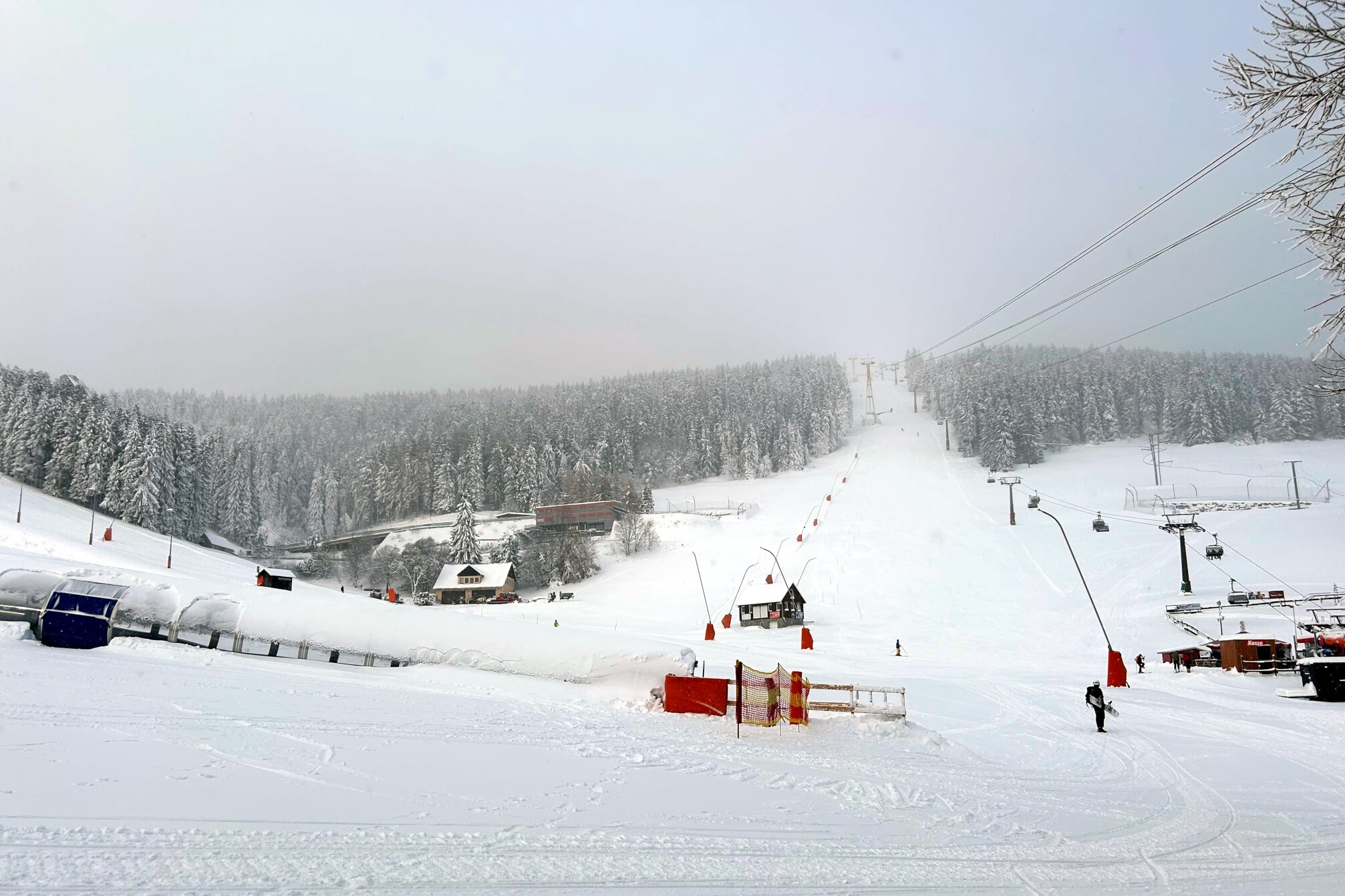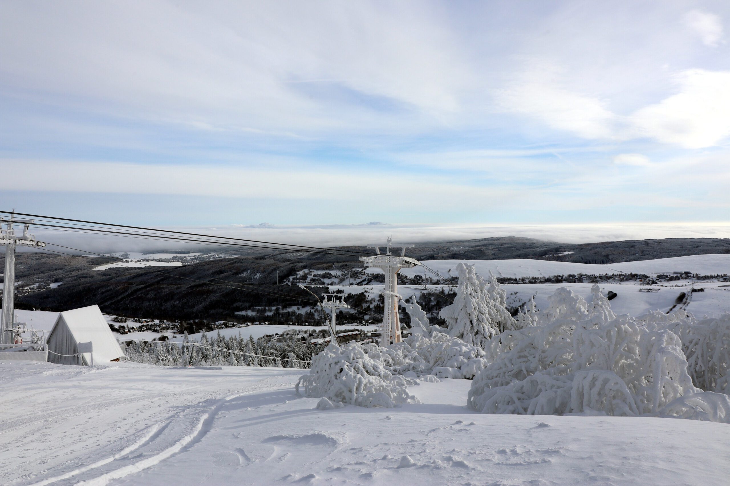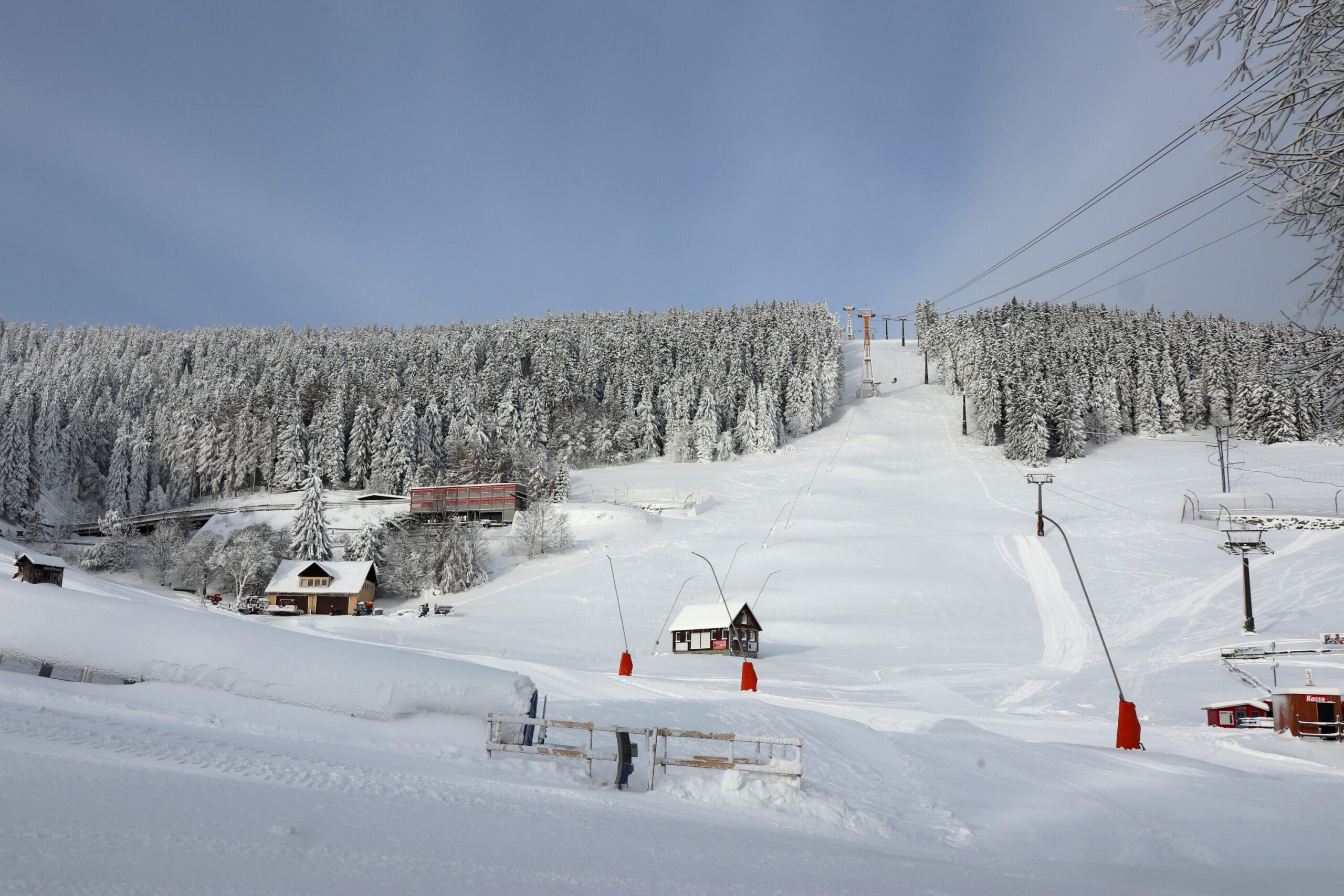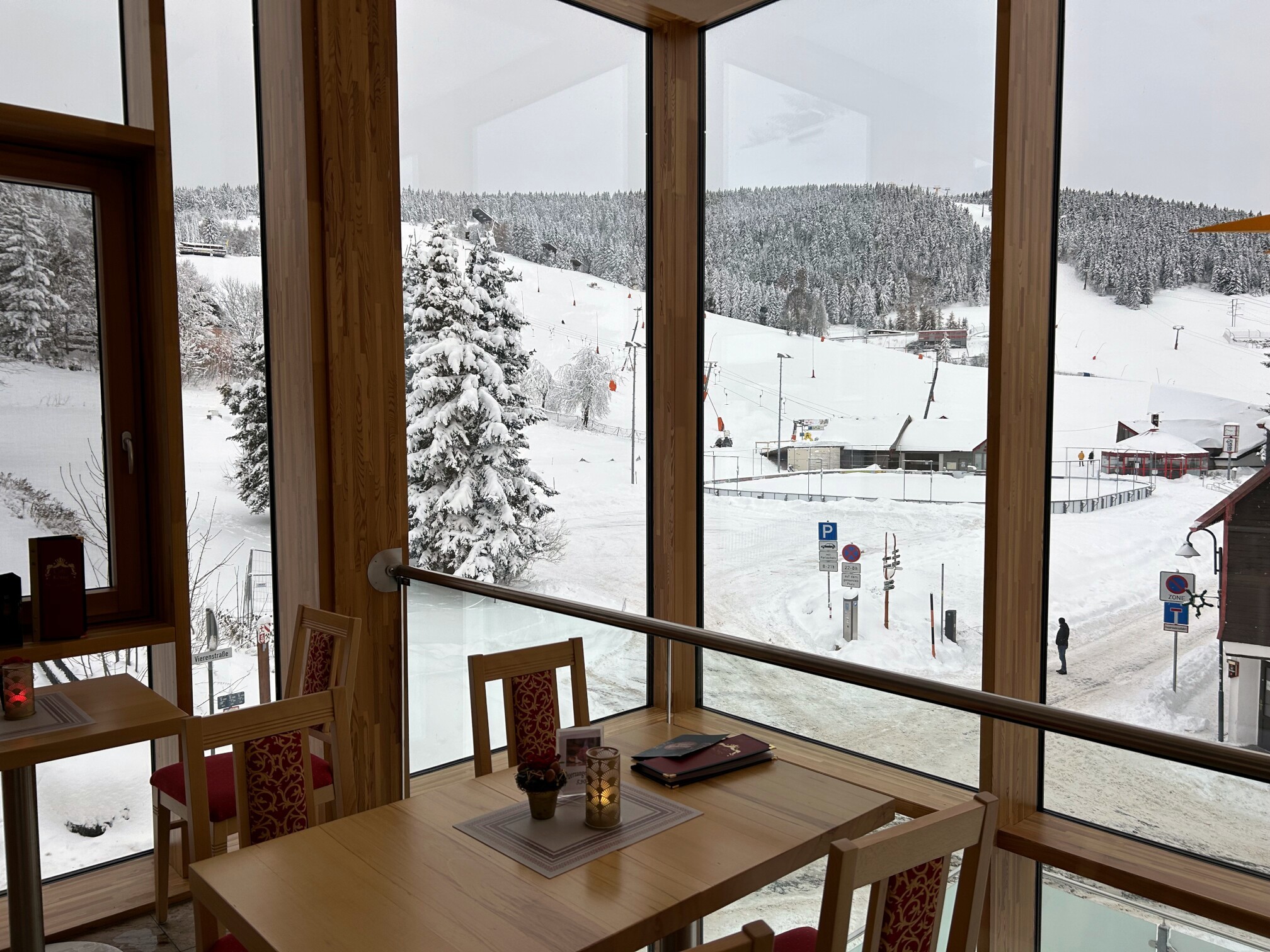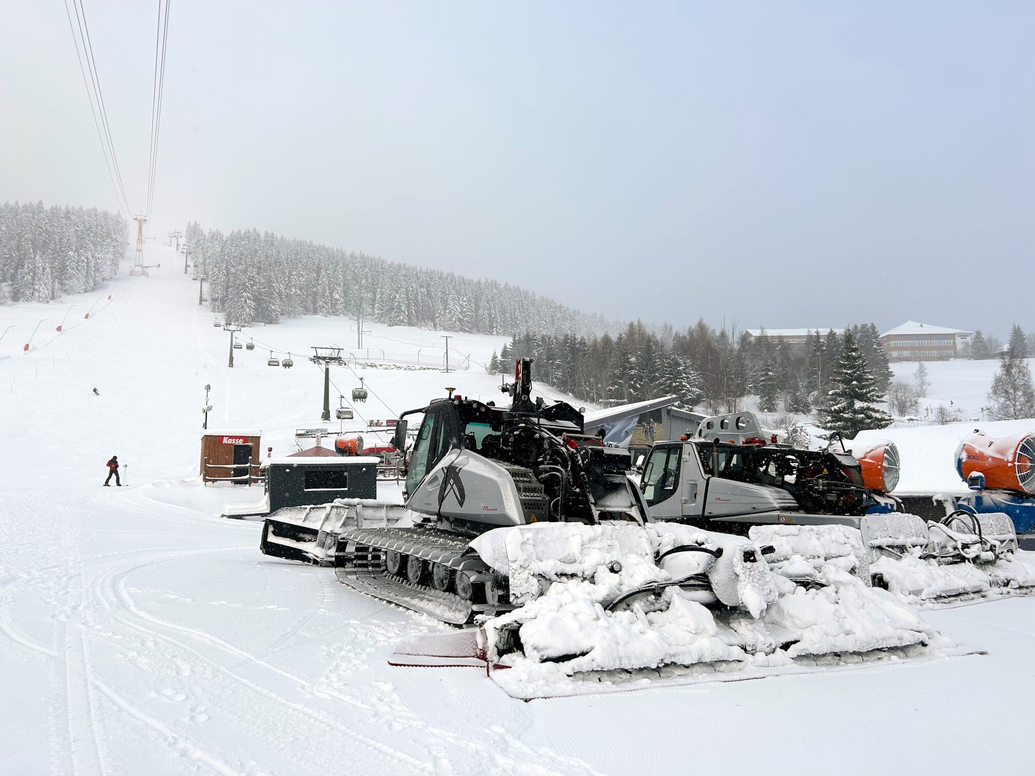 Am Mittwoch, unserem Abreisetag, wurde die Skisaison in Oberwiesenthal eröffnet. Mit der ersten Seilbahn fuhren wir zum Gipfel. In der Bahn waren eine handvoll Wintersportler, aber keine weiteren Touristen. Im Gegensatz zum Montag hatten wir den Gipfel für uns allein. Der Sessellift zum Gipfel war schon gut ausgelastet.