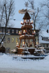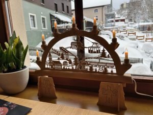 Mit zwei Pausen kamen wir gegen 16 Uhr im Hotel an. Eine Stunde später waren wir dann auf dem Adventsmarkt in Oberwiesenthal zum Konzert des Bläserquintett des Bergmusikkorps „Frisch Glück“. Mit dem Zug wären wir im günstigsten Fall um 17:19 Uhr angekommen und hätten das Konzert nicht mehr geschafft.